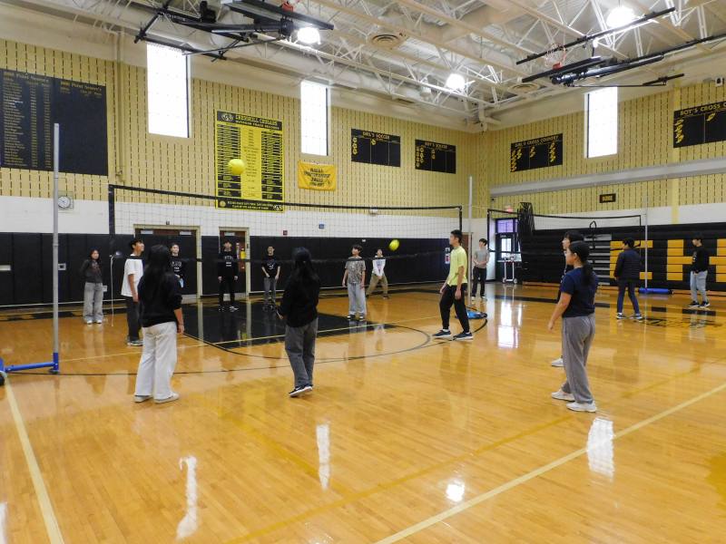 最初はgymに集まり、ice breaker activitiesとして、バレーボールやバスケットボール等に参加しました。今日までの間にメールでのやり取りはしていたものの、実質本日が初対面のため互いに少し緊張していた様子です。でも、すぐに打ち解け授業へと進みました。