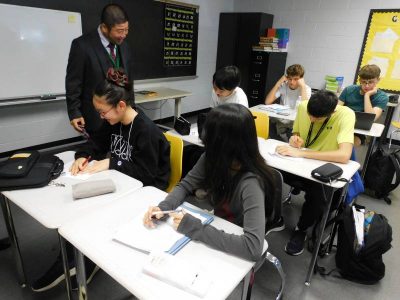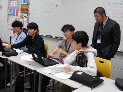 交流内容は、NJ校生徒1人が2~3名のクレスキル校生徒と一緒に授業に参加する形式です。NJ校とは全く雰囲気が違うため、中等部生徒達には多少戸惑う様子も見受けられましたが、クレスキル生徒たちが一生懸命サポートしていました。ただ、校舎がとても広く、NJ校生徒 を見つけることがなかなかできませんでした。