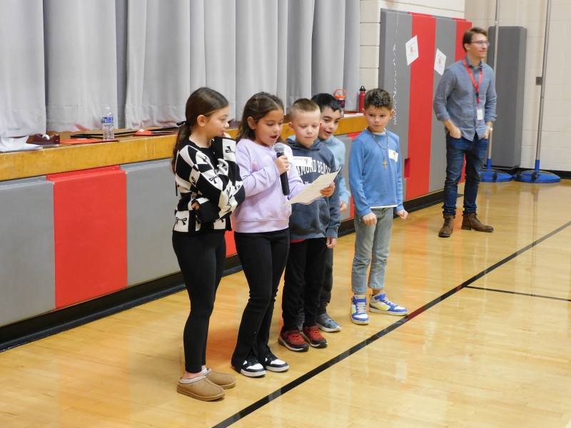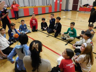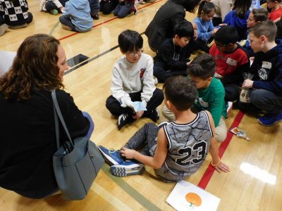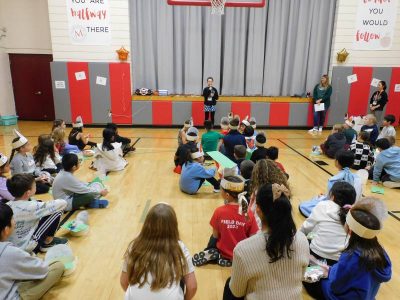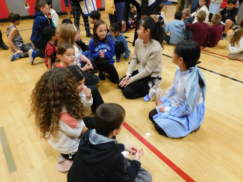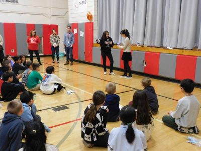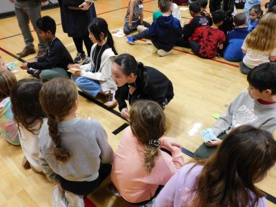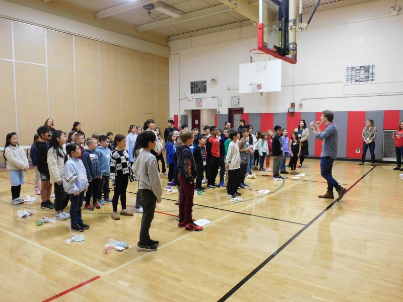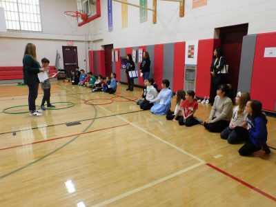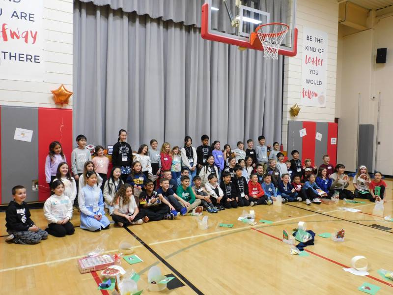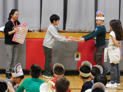 初等部児童は本日、Manito Elementary Schoolにお邪魔し、学校間交流を行いました。最初は、全員講堂に集まり、プレゼントを渡したり、代表者からの挨拶や一緒に歌を歌ったりしました。
