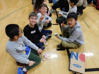 次に、本校ESL講師と6年生代表でNJ校が用意した折り紙を使ったゲームの紹介をし、その後お互い質問し合い、交流を深めました。