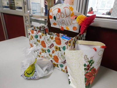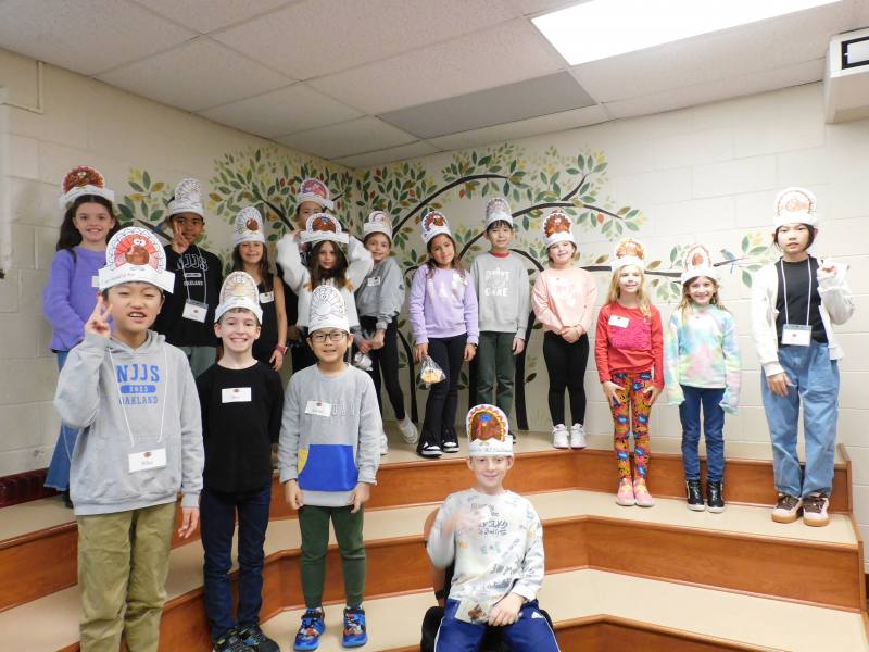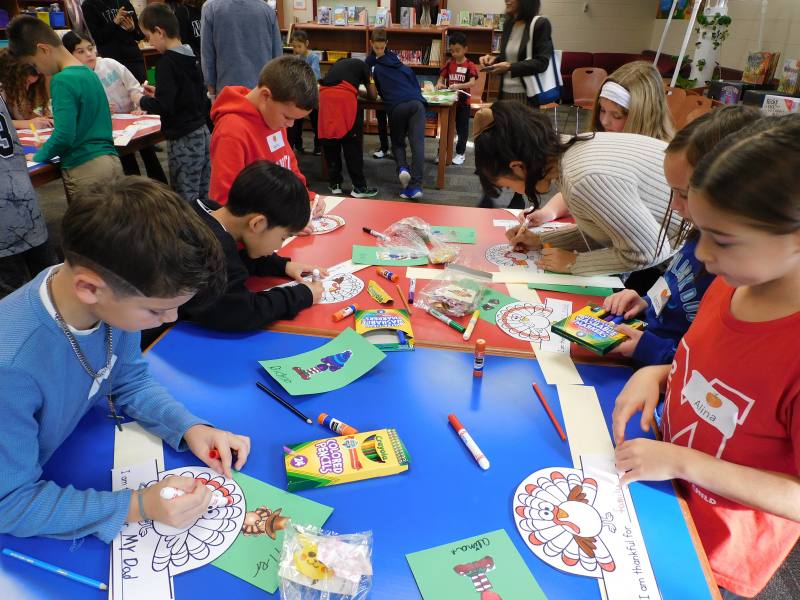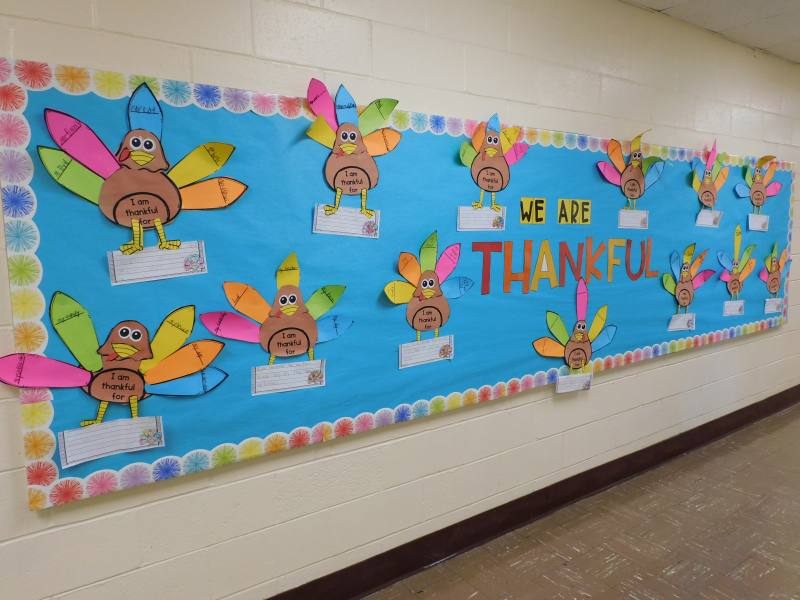 図書室では、turkeyの絵の下に誰に(何に)感謝するかの英文を書いた帽子を作りました。