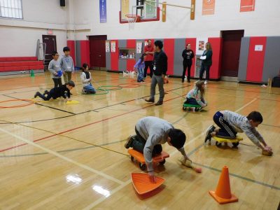 その後、グループごとに3つの活動に取り組みました。講堂では、いかだに見立てた用具に乗り協同して島に渡るゲームや、サイコロの番号に従ってオリジナルのturkeyをつくるアクティビィティを行いました。