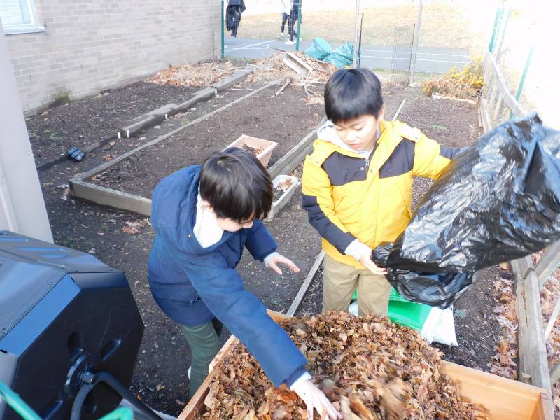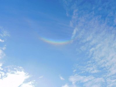 昼休み、監護当番で外に出ていると、初等部児童がメイプルの落ち葉を集めて教頭先生が作ってくださった木箱に入れていました。落ち葉は長い間外にあったため、ちょうどいい具合に朽ちていて、来年には良質な肥料になりそうです。そんな時誰かが、「空に虹だ!」と叫んだため、上を見上げると、きれいな青空の中に虹のように輝く雲(彩雲)が確認できました。(肉眼ではもっと大きく見えました。)