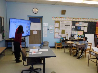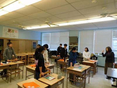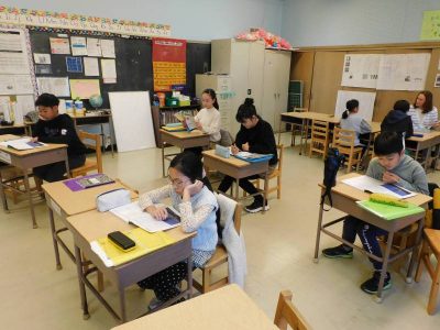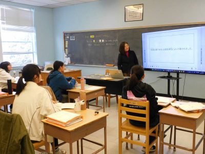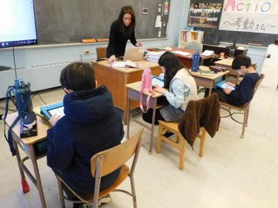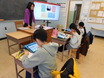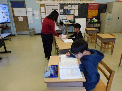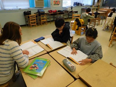 4~6年生1時間目は、ESLです。Na先生の授業では、最近転入した児童と以前からいる児童のグループに分かれ、別々の課題に取り組んでいました。Ro先生の授業では、テキストに関連する課題に取り組んでいました。