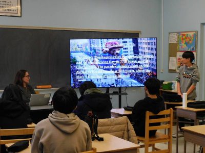 中等部3時間目は、ESLです。Re先生の授業では、先週のサンクスギビングに関わるプレゼンをしていました。サンクスギビングに関わるカナダと米国の違いや当日の食事メニューなどスライドを使いながら丁寧に説明していました。