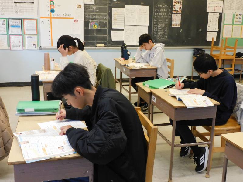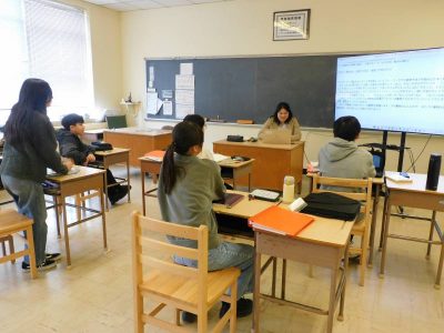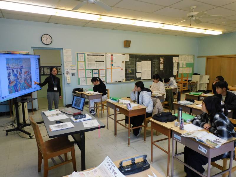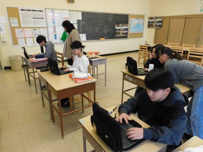 同じ時間8年生は、社会科です。今日は、「江戸幕府の滅亡」がテーマで、教科書・プリントを使いながら当時の各藩の動きなども確認しながら理解を深めていました。