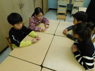 2年生5時間目は、算数です。今日は、一人一人に●のついた小さな紙が渡され、その数をかけ算やひき算を使いながら個数を当てる計算式を考えました。次にその考えを順番に発表していきました。