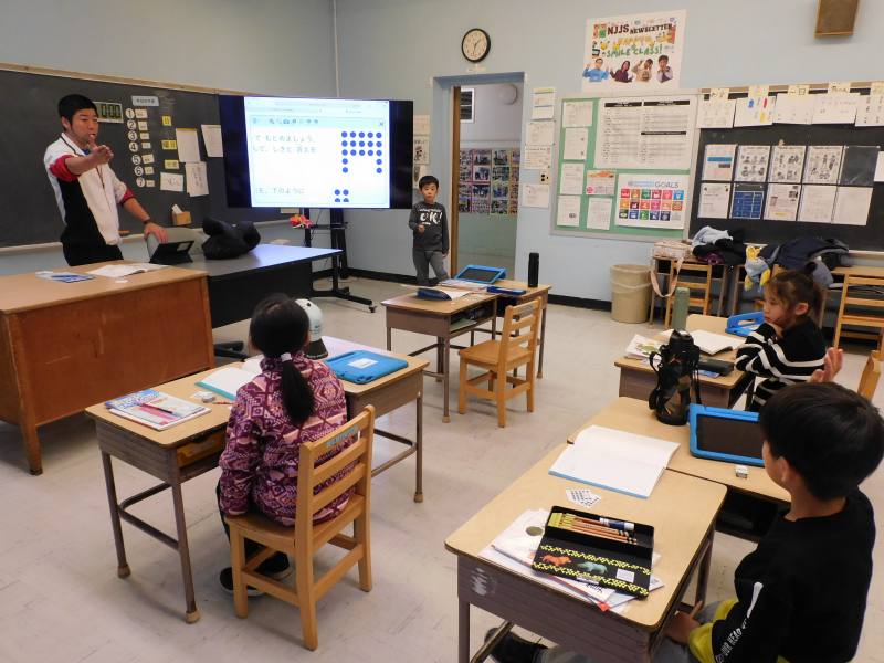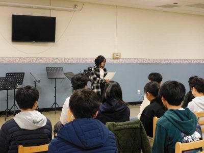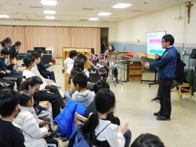 NJ校では毎月、全校集会があり、委員会からの報告やお知らせ、担当教諭からの話などがあります。本日も最初に、生活環境員会から教室環境コンテストの表彰がありました。そのあと、担当教諭からドラム演奏の実演と各自椅子に座ったままの実技指導がありました。