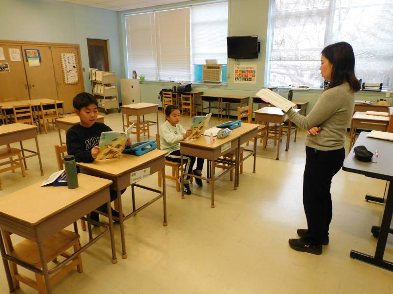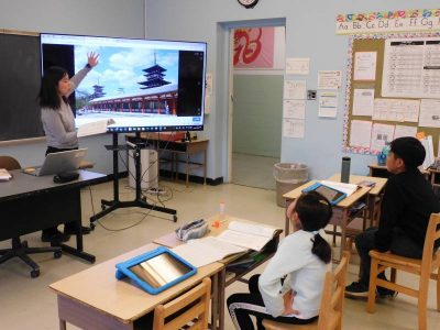 同じ時間4年生は、国語です。今日は、「短歌と俳句に親しもう」をテーマに、実際の作品を音読しながら当時の情景を思い浮かべていました。途中、奈良にある薬師寺の画像を見ながら作品の持つイメージをさらに膨らませていました。
