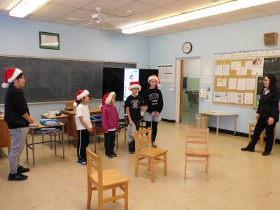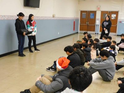 もはやNJ校の代名詞ともいえるキーワード、“NJファミリー”を象徴する取組のひとつが縦割り活動です。学部ごと、または本日のような全校をひとつにした活動も本校の特色です。今日は、メイプルタイムに全校レクとして、“クリスマス会”が開かれました。代表委員が教室や廊下に隠した小さな付箋を見つけるというゲームです。付箋には番号が書かれており、その番号の商品がプレゼントです。この品々は、本校児童生徒からドネーションとして集められたものです。小さな初等部の児童たちも、大きな中等部のお兄さん・お姉さんと一緒に探しました。途中、中等部の生徒たちは、まだ見つけられていない児童を優しくサポートする場面も見受けられました。縦割り活動では、思いやりや優しさ、相手を尊重する心が育まれます。これからもこの取組を大切にしていきます。