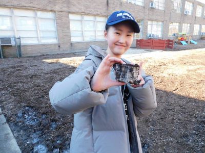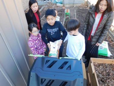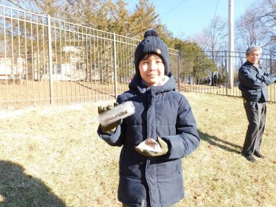 昼休み監護当番で外に出ると、初等部がコンポストに果物の皮などを入れていました。また、昨日に引き続き、氷のかたまりを見せてもくれました。昨日並みの寒さでしたが、日陰にある霜柱は全く溶けていませんでした。