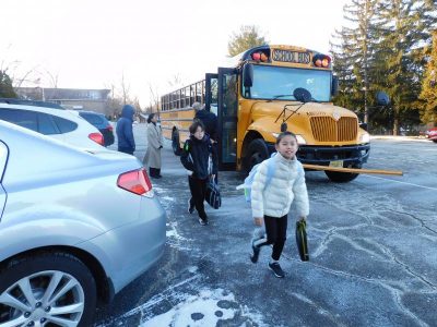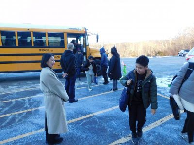 今朝のオークランドは昨日の雪も残り、メイプル広場は雪景色です。また、風がとても強くブリザードのようでした。登校時の気温は、-5℃、体感温度は、-10℃でしたが実際はそれ以上に寒く感じました。そんな中、約2週間の冬季休業を終え、子供たちは元気に登校してきました。今日から3学期のスタートです。