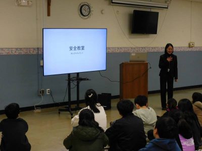 その後、安全教室が開かれました。バスの乗り方、校内での過ごし方等再度確認されました。始業式に続いてのお話でしたが、NJ校の児童生徒は集中して話を聞いていました。