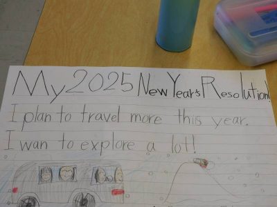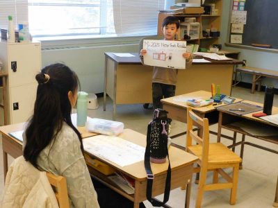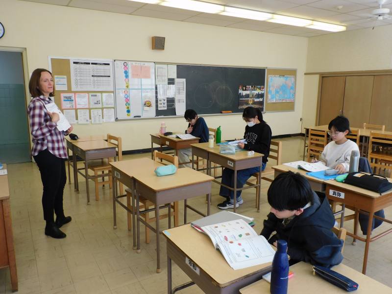 2,3年生3,4時間目はESLです。私がRe先生の教室に入った時は、今年の抱負を紹介しているところでした。Ro先生の授業では、来週の祝日に関連したプリントに取り組んでいました。