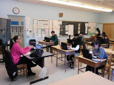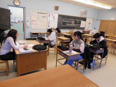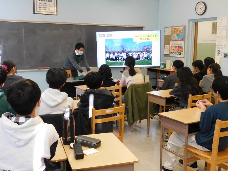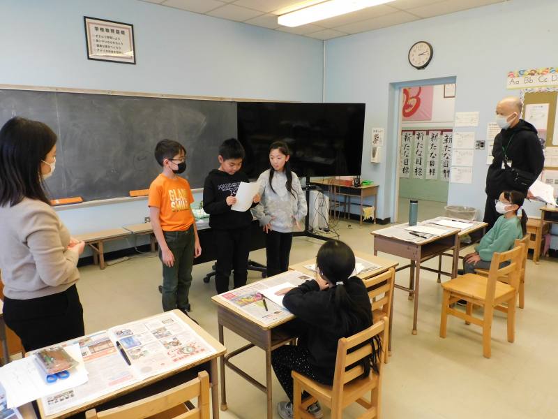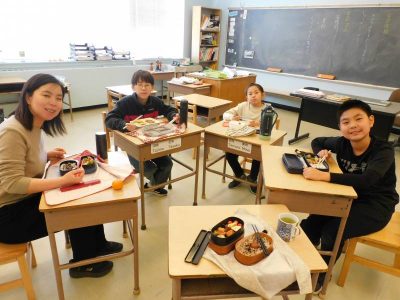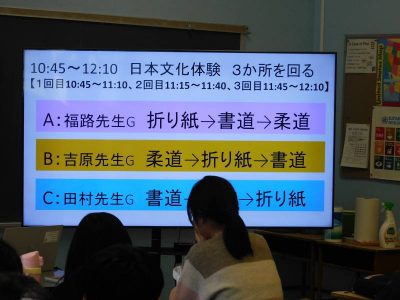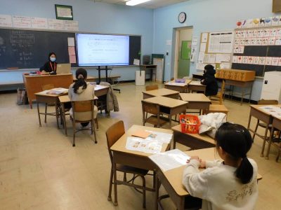 NJ校の特色のひとつに学校間交流があります。昨年、初等部・中等部ともに11月、現地校を訪問し交流を行いました。そして、今回は現地校の児童生徒が本校を訪れます。初等部は、今月末、中等部も来月中旬実施します。中等部は6時間目、8年生教室で全体への説明があった後、グループごとに分かれてその準備をしました。初等部は7時間目、マニトー校児童が来ているイメージで当日の活動内容を実際にやってみました。それぞれ学校の環境や規模は異なるものの、現地校の子供たちが日本文化に触れる機会になればと思います。