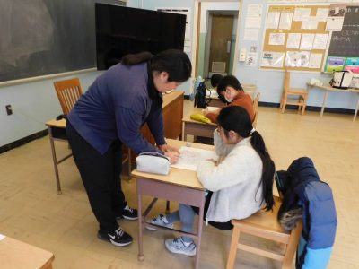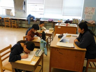 5年生4時間目は、国語です。私が教室に入った時はコンクールに出品する硬筆の練習、清書を行っていました。練習用で指摘された箇所に注意しながら、一文字一文字丁寧に書いていました。