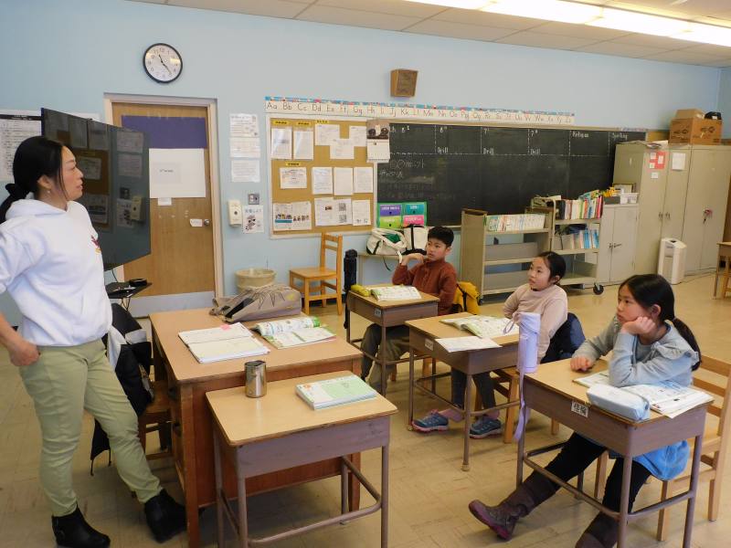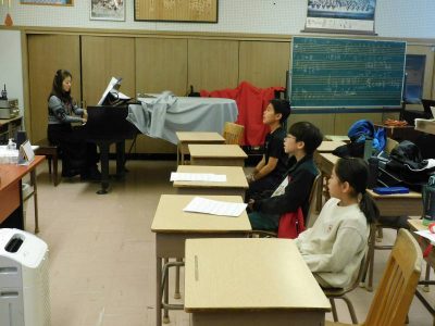 同じ時間4年生は、音楽です。前半は、卒業式・入学式で歌う、日米両国歌や校歌の練習をしました。次に、教科書にあるポロネーズのCDを聞き、メロディーを確認していました。
