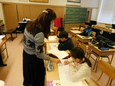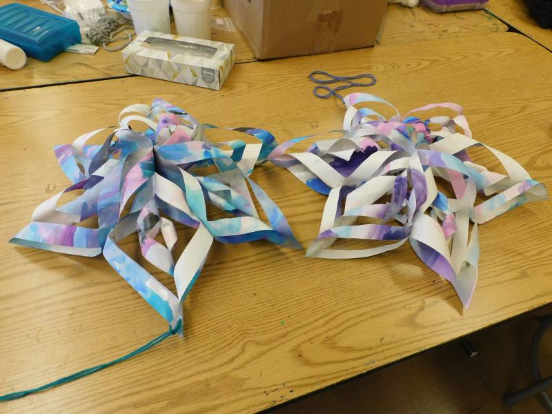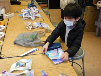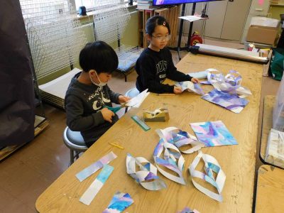 2年生はARTの時間でした。雪の結晶に見立てた作品を制作していました。自分たちで色付けした紙を切り、折り曲げながら互いにつけていくと、写真のような作品に仕上がります。複雑な作業もテンポよく進めており、驚きました。
