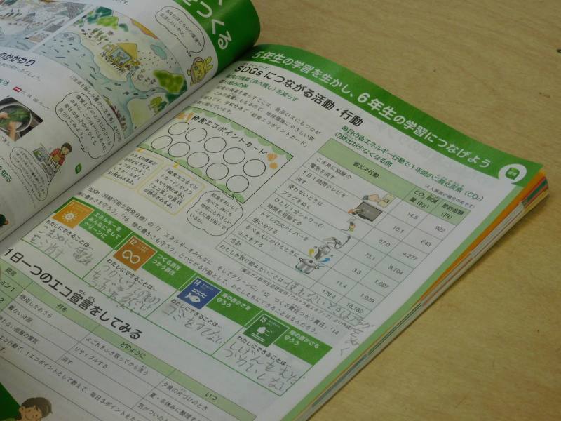 5年生は、家庭科です。私が教室に入った時は、SDGsにつながる“エコな取り組み(活動)”を考えていました。トイレ、お風呂、洗濯等の話題が出ていました。
