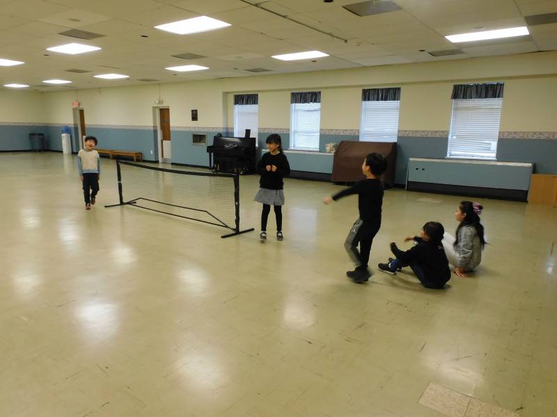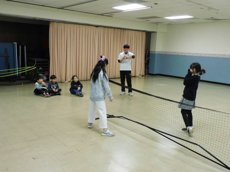 4時間目2,3年生は、体育です。今日は最初に、ピックルボールのネットを使ったウォームアップを行いました。ネットを回りながら20秒間追いかけっこをし、鬼がタッチできたら勝ちです。