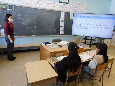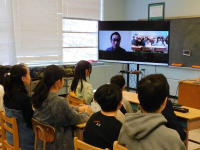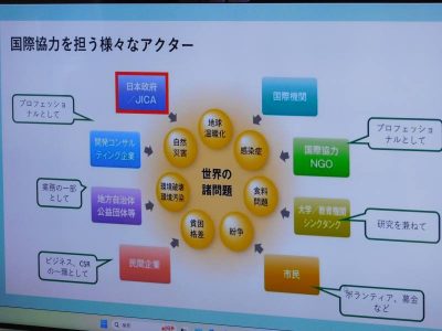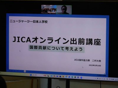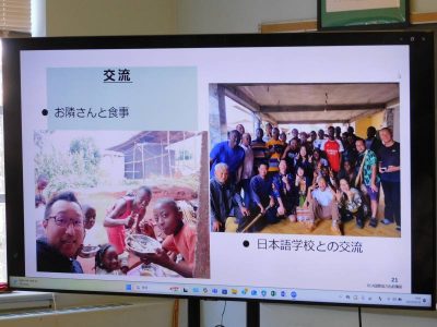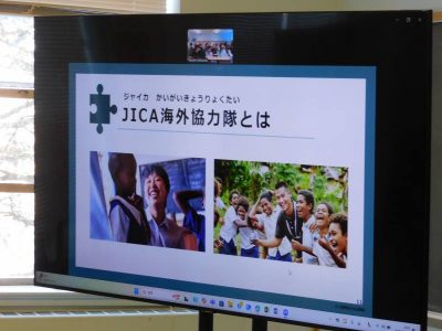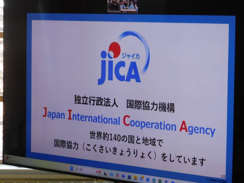 JICA(Japan International Cooperation Agency:独立行政法人国際協力機構)では、教室と世界をつなげるオンライン出前授業を実施しています。本日1時間目、社会科の授業で、JICA青年海外協力隊員としてカメルーン共和国に派遣されている二村大樹さんとのオンライン授業が行われました。テーマは、「国際貢献について考える」。二村さんは現在、カメルーン共和国で現地の方々に農業を教えられています。通信環境もあまりよくない中、ご自身の話からカメルーンでの生活や現地での活動内容についてスライドを使いながら説明していただきました。また、生徒からの質問にも丁寧にお答えいただき、遠いアフリカがまた少し身近に感じるようになりなりました。授業に参加した6年生以上の児童生徒にとって、国際貢献について考える良い機会となりました。