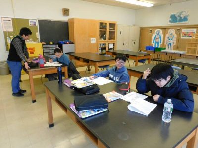 中等部は6、7時間目、いよいよ明日に迫ったクレスキル校との2回目の学校間交流に向けセクションごとにわかれ、最後のリハーサルを行っていました。