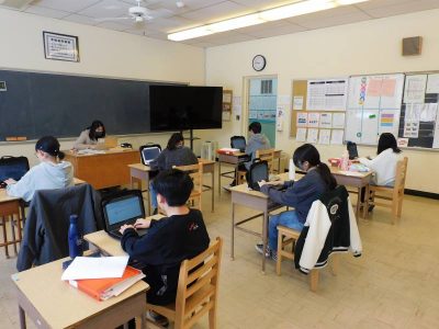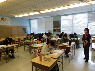 9年生2時間目は、理科です。今日は復習として、8年生2学期の定期テストに挑戦していました。次の時間からその頃の学習内容について、実験をしながら復習する予定です。