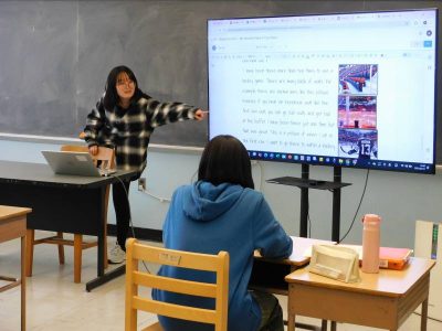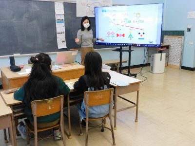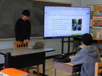 8年生6時間目は、英語です。今日は自分のお好みの場所についてプレゼンしていました。湖やモール、世界遺産や博物館など様々な場所を紹介してくれました。