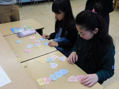 3年生1時間目は、英語です。最初にリスニングでものの形や個数に関する復習をしました。そのあと、今週のバレンタインデーにちなんだハート型を用紙に書かれているメッセージをアルファベット順に並び替える活動を行いました。