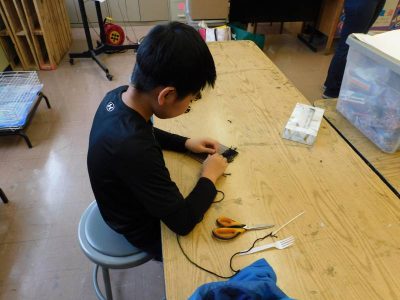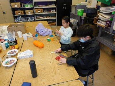 同じ時間4年生は、アートです。小さな段ボール用紙に毛糸を交互に編んでいました。段ボールの表と裏で偶数、奇数と編み方を変えることで見栄えが違ってきます。根気のいる作業ですが、子供たちは手際よく作業を進めていました。