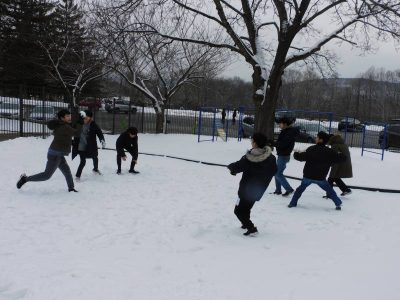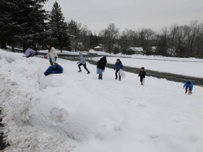 本日もメイプルタイムや昼休みに子供たちは、雪遊びをしました。今シーズンは本当によく雪遊びができています。ビニール袋でできた特製のそりもかなり疲れて?きているように感じます。