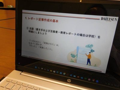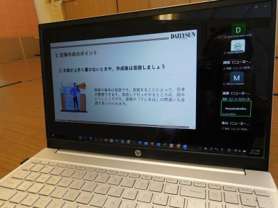 本日放課後、NJ校教員はNY校で開催されたオンライン研修会に参加しました。内容は、「教育レポート作成の仕方」です。本校は“学校便り”が月1回、“学級便り”が週1回配信されます。日々の活動や子供たちの様子、各種連絡事項がその主な内容です。その便りをより分かりやすく、読みやすいものにするための研修が今回のねらいです。今後は、本日の研修内容を生かし、簡潔でわかりやすい表現等に注意しながら作成していきます。