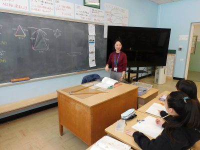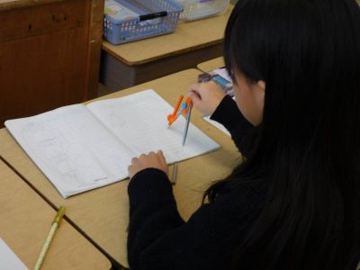 同じ時間3年生は、算数です。今日は二等辺三角形の学習です。コンパスと定規を使って、指定された長さの図を慎重に描いていました。
