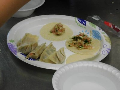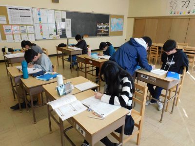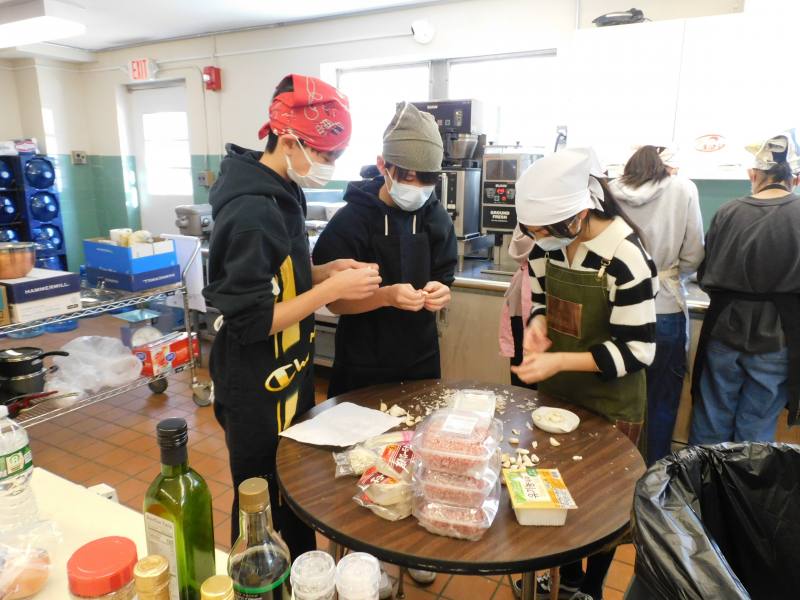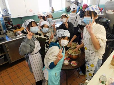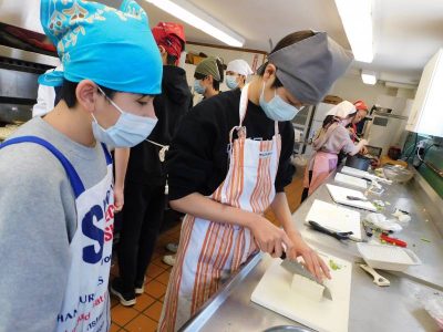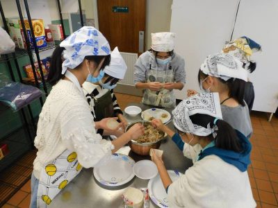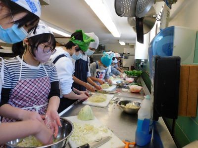 中等部7,8年生は3・4時間目、調理実習です。本日のメニューは、ごはん、みそ汁、焼き餃子、もやしと青菜のナムルです。餃子のあんに入れるキャベツ、ニラ、ニンニク、ショウガなどを細かく切っていました。餃子の皮であんを包む際は、世間話?をしながら楽しいそうにしていました。