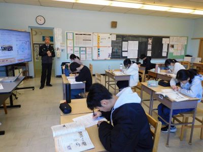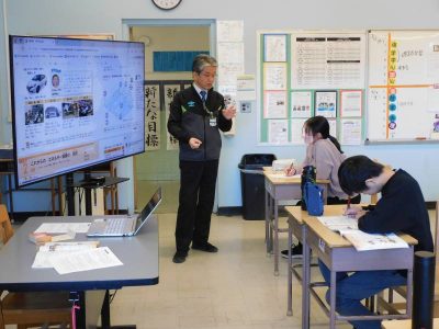 同じ時間8年生は、技術科です。今日のテーマは、「エネルギー変換技術の最適化」です。電気自動車等を例にプリントを使いながら学習していました。