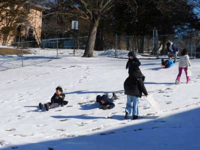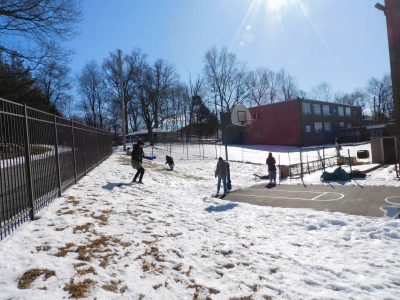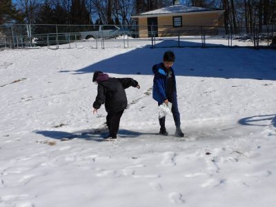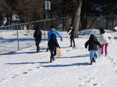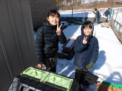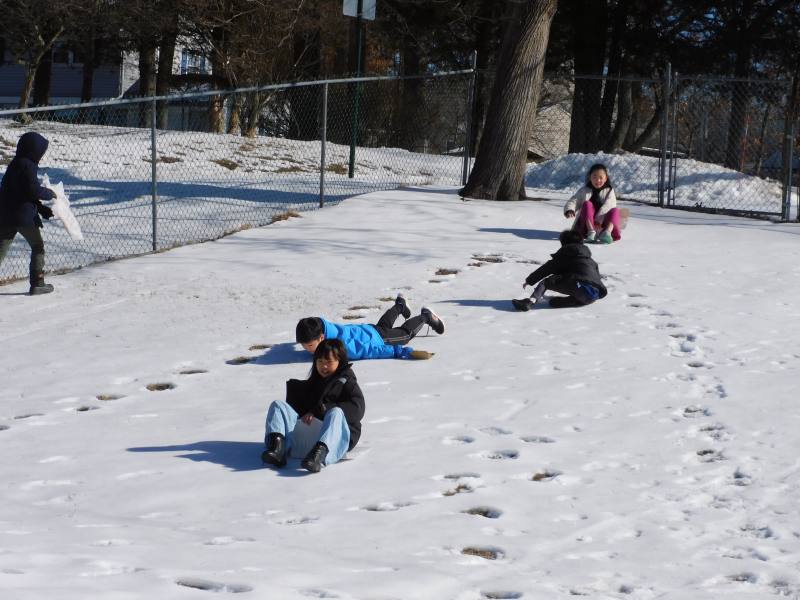 今まで積もった雪に雨が降り、午前中は凍っていました。メイプルタイムや昼休み、子供たちは中庭でそり遊びを楽しんでいました。コンポストにお弁当の果物の皮などを入れてくれる児童もいました。
