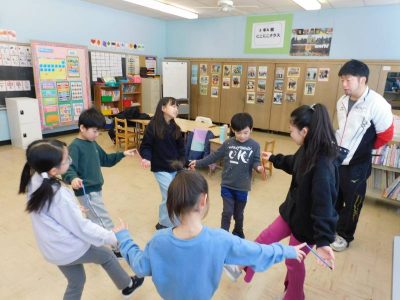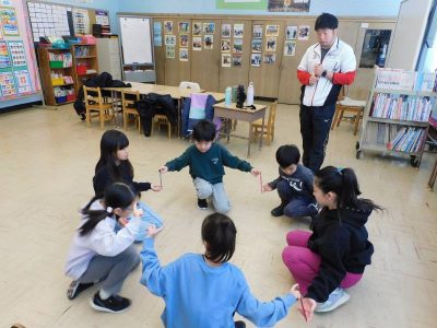 2,3年生3時間目は、体育です。今日は、3年生教室で行いました。私が教室に入った時は、互いに鉛筆を人差し指で支え、落とさないように移動したり、片足を挙げたりする運動をしていました。