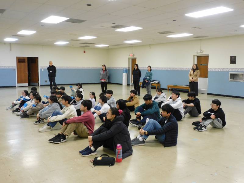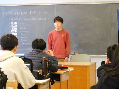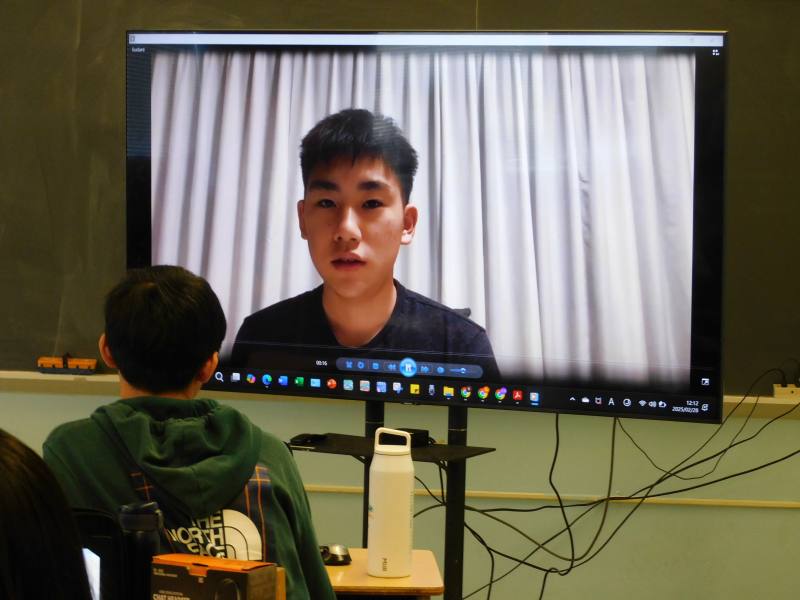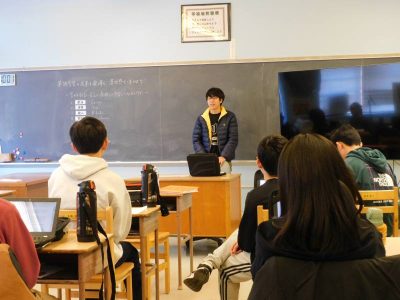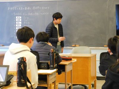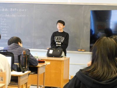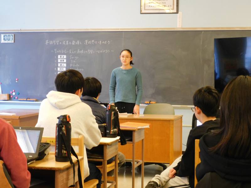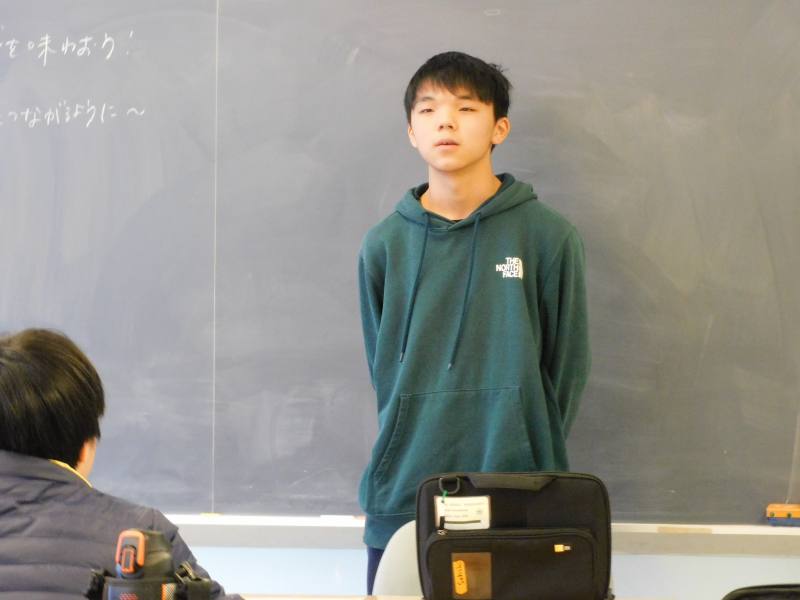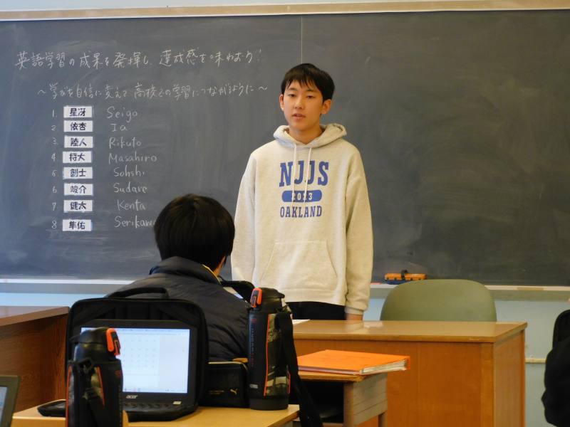 4時間目9年生は、英語です。今日は今年度最後の授業ということで、レシテーションコンテストを行いました。受験生という忙しい中、複数の中から選んだ話を一人一人発表しました。ジェスチャーを交えたり、オーディエンスを意識した発表が続きました。中には受験関係でまだ国内にいるため、録画での参加という生徒もいました