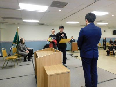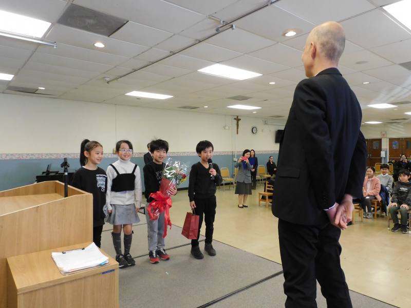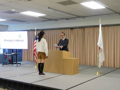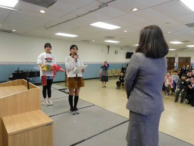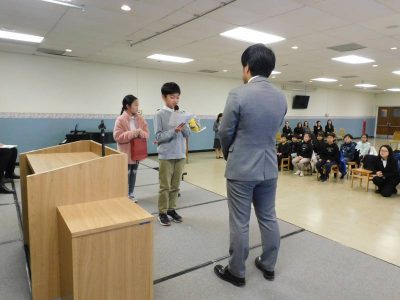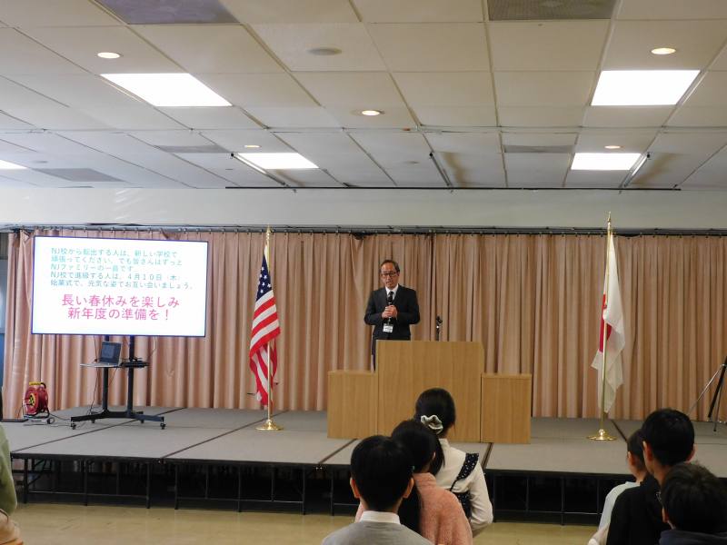昨年4月10日にスタートした2024年度も、本日の修了式をもって終了となります。式では、各学年の代表者が通知表裏面に記されている修了証を受け取りました。式の流れは卒業式と同じです。全員卒業式に参列していたため動きもよく、緊張感をもって式に臨みました。一人一人の動作はとても立派でした。修了式に続き、離任式も行われました。今年度は5人の教員がNJ校を卒業します。