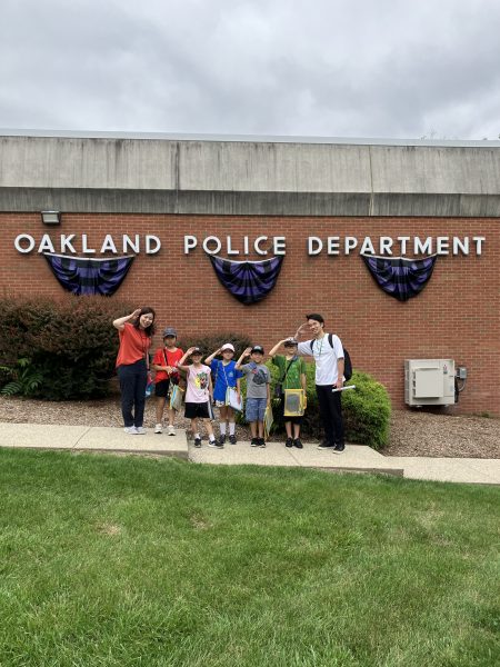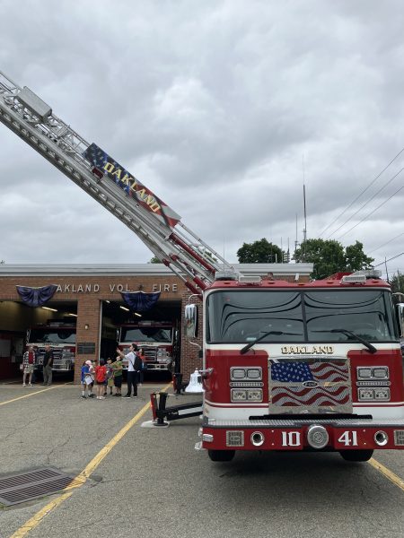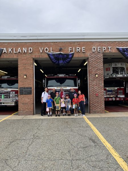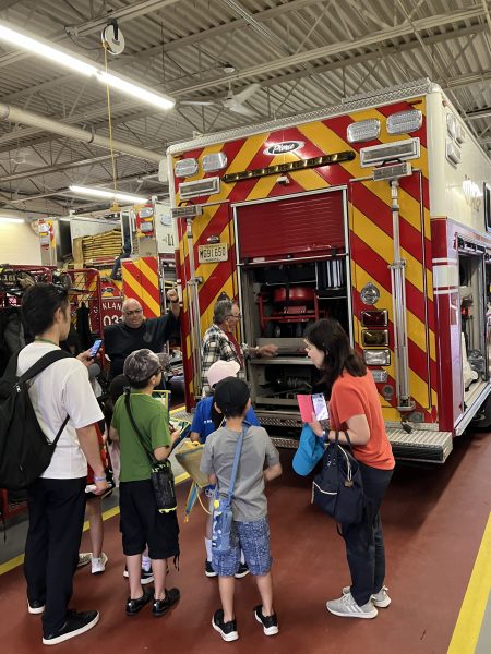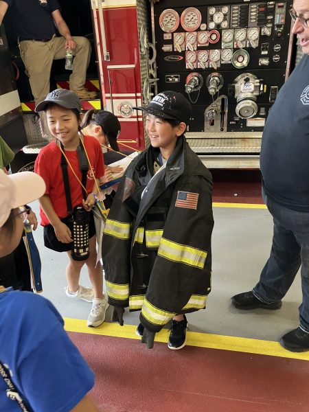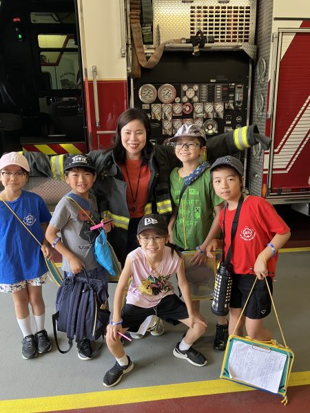 そのあとオークランド消防署に。こちらでも丁寧な対応をしていただきました。我々のためにはしご車を伸ばして見せてくれ、防火服を着せてもらい消防車にも乗せていただきました。ここでもたくさん質問をしていました。赤とピンクの消防ヘルメットをお土産にいただきました。2つの施設を訪問して、アメリカは子どもにとても優しい国だと強く感じました。大変貴重な経験ができました。