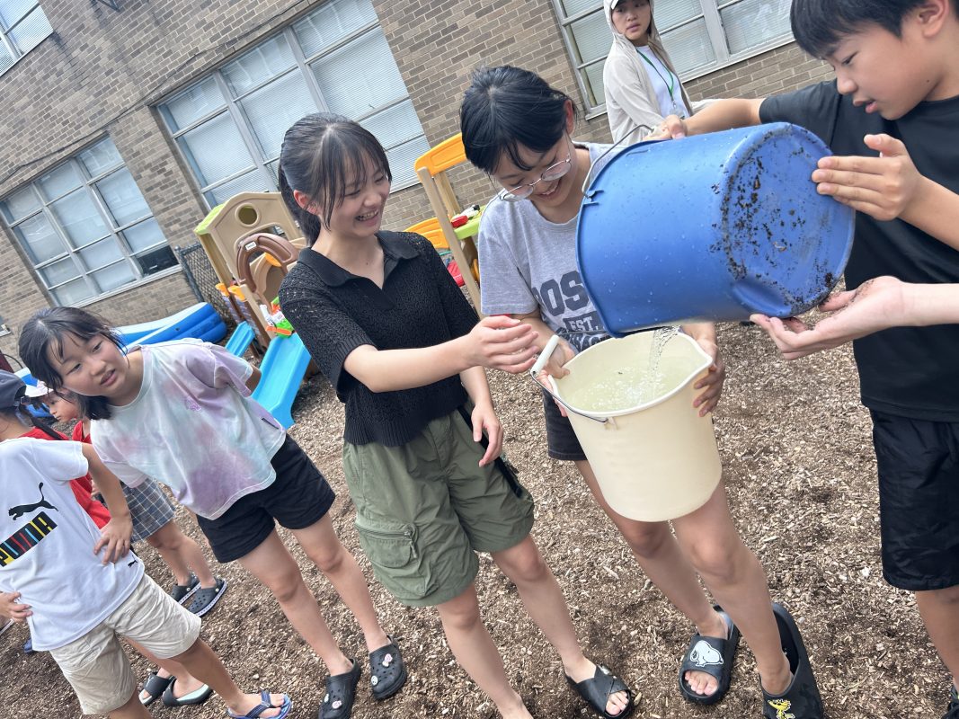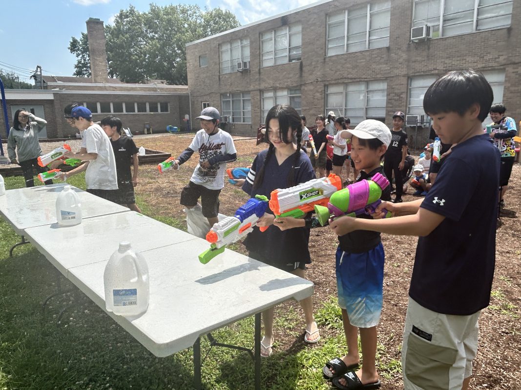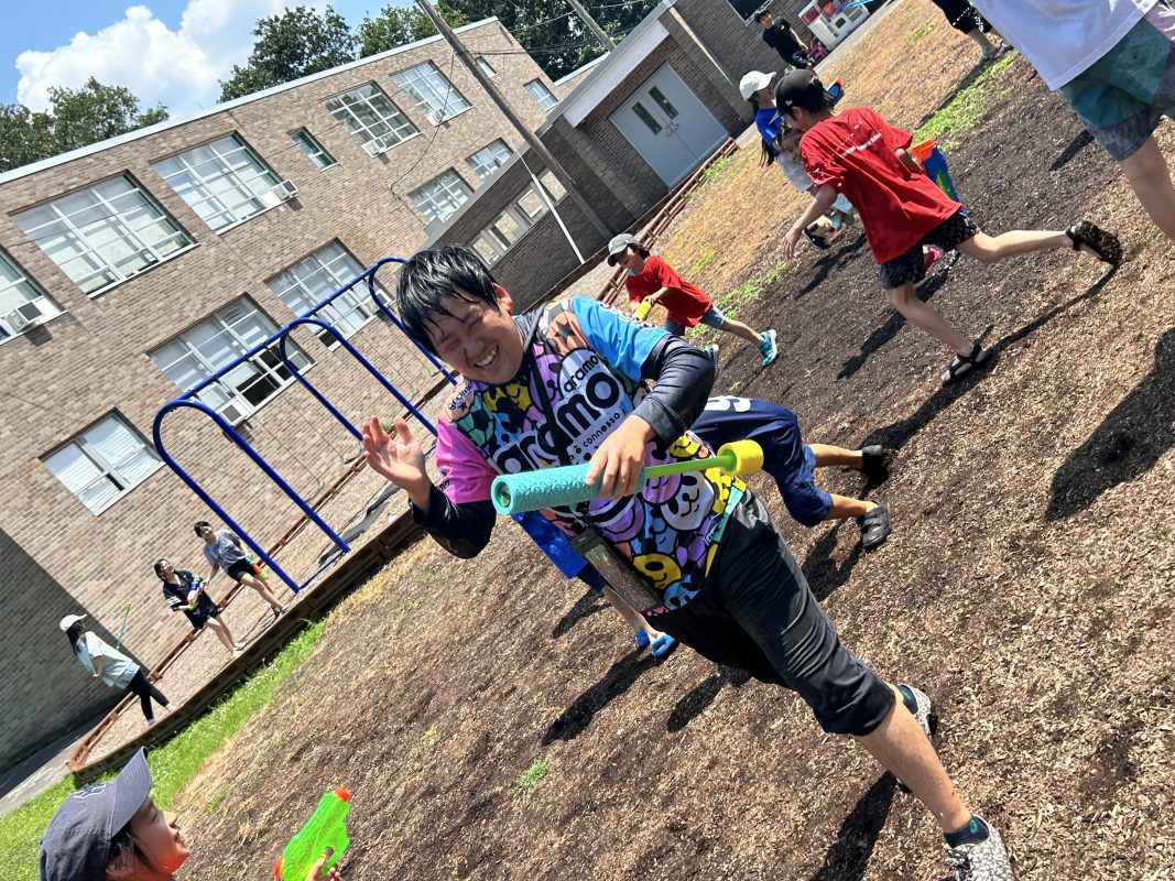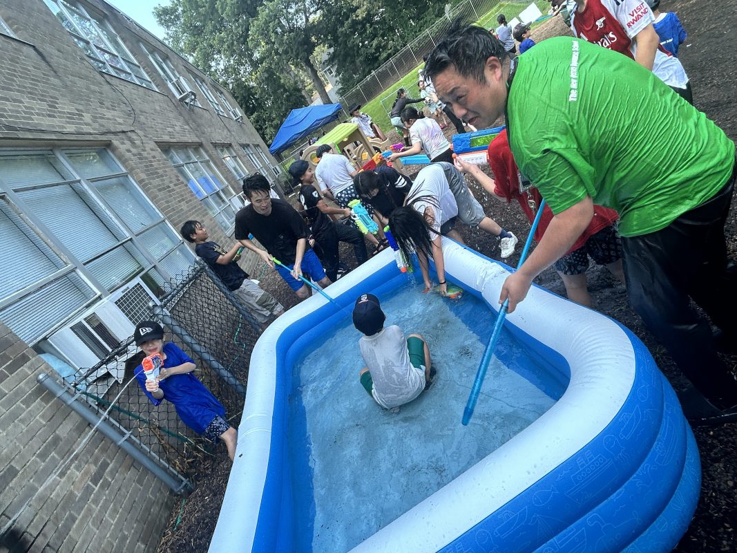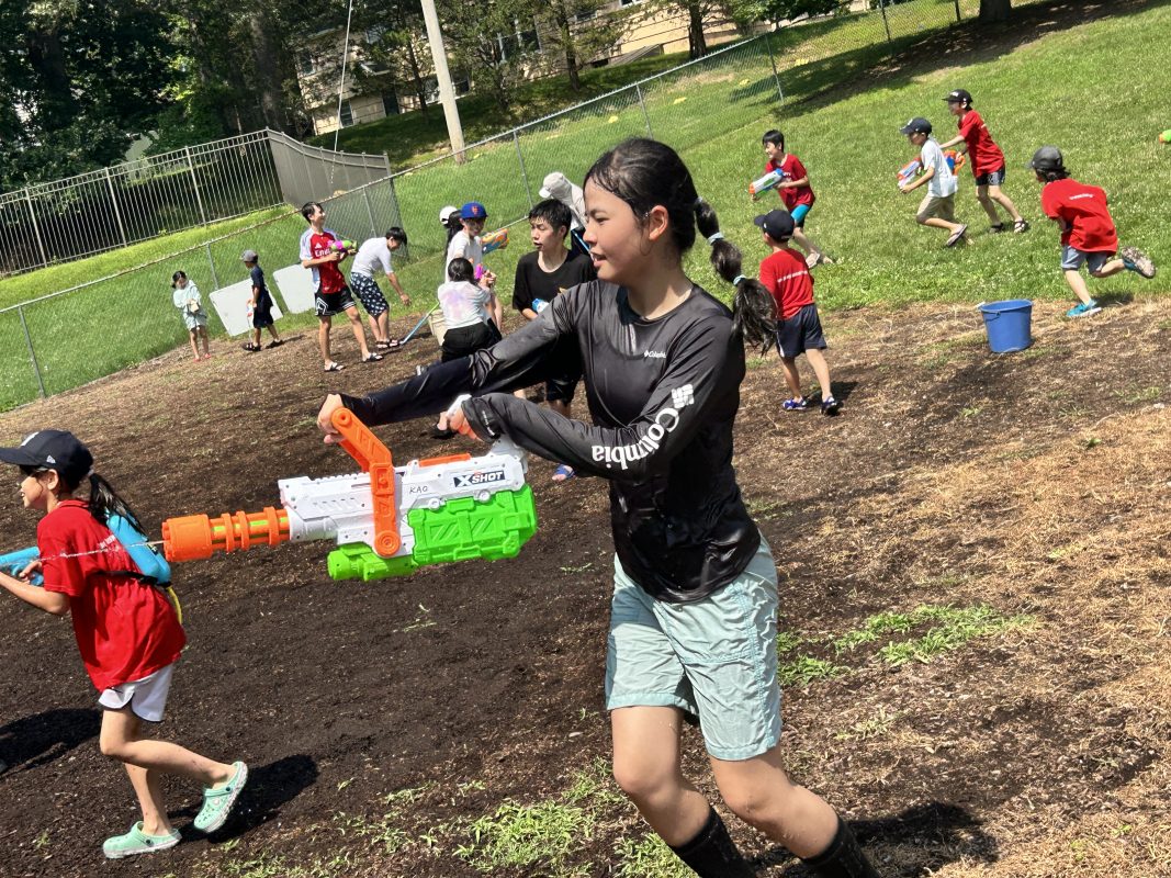 7月3日(木)6時間目にメイプル広場で水遊びを行いました。最初に3つのチームに分かれて水鉄砲を使っての的当て競争を、次に各チームで2つのバケツを使ってのバケツリレーゲームを、最後に持参の水鉄砲を使って誰彼かまわず打ちまくるというレクを行いました。暑い日となり、最後には先生方もびしょぬれに。NJ family らしい楽しいイベントとなりました。
